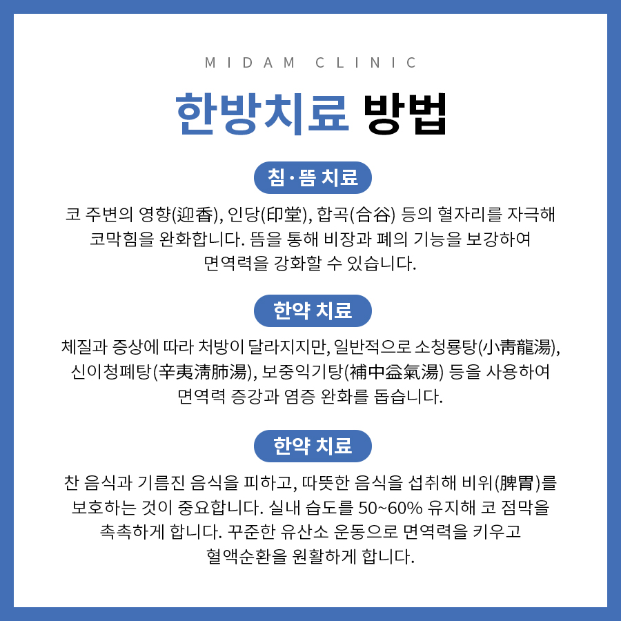 - ħ Ä¡·á: ÄÚ ÁÖº¯ Ç÷ÀÚ¸®(¿µÇâ, Àδç, »ó¼º µî)¸¦ ÀÚ±ØÇÏ¿© ºñ° ±â´ÉÀ» ȸº¹ - ¶ä Ä¡·á: ÄÚ Á¡¸·ÀÇ Ç÷¾×¼øÈ¯À» µµ¿Í ¿°Áõ °¨¼Ò - ÇѾà Ä¡·á: ¸öÀÇ ¸é¿ª·ÂÀ» ³ô¿© ºñ¿°À» ±Ùº»ÀûÀ¸·Î Ä¡·á