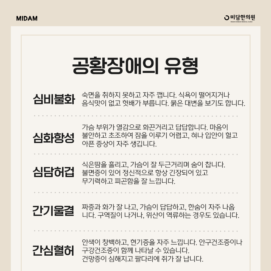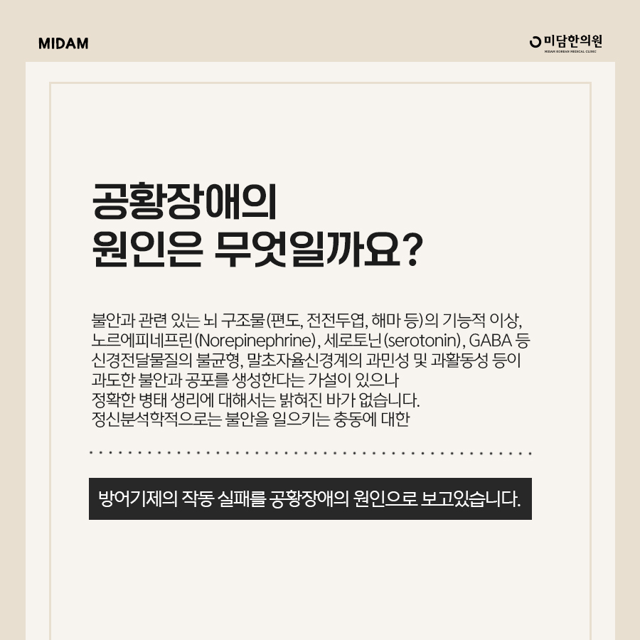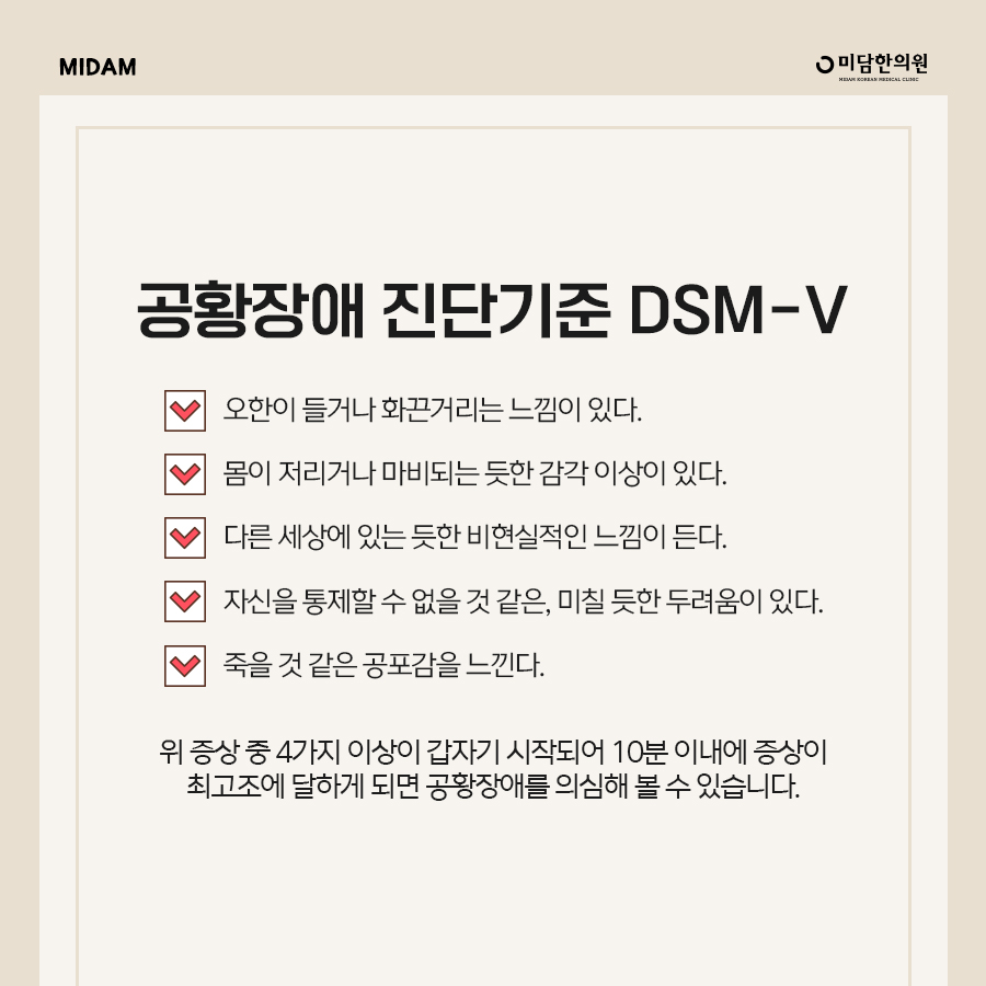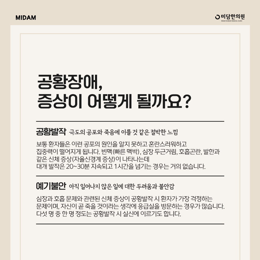 Like other diseases, panic disorder can become chronic if treatment and management are delayed. The anxiety that started with panic disorder eventually leads to ¡â pan-anxiety disorder ¡â social phobia ¡â depression ¡â personality disorder, etc., which can lead to a vicious cycle. Therefore, if you suspect panic disorder, it is desirable to get a diagnosis early. In particular, you can return to healthy daily life as before through steady treatment and management.