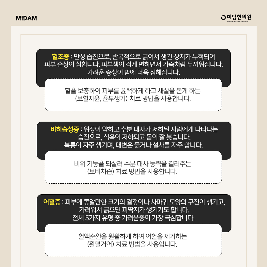 Hematosis: Chronic eczema accumulates wounds caused by repeated scratching, causing severe skin damage. The skin color becomes dark and thick like leather. The itchiness gets worse at night.