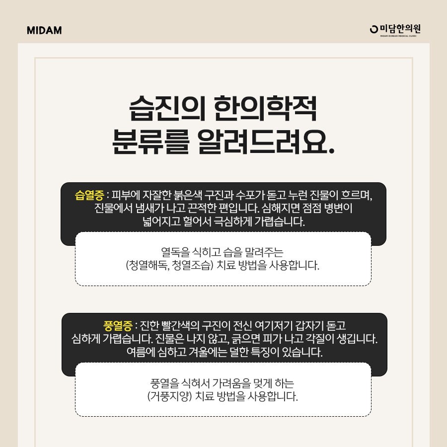 Moisture fever: Fine red pimples and blisters on the skin, yellowish mucus flows, and it is sticky. When it gets worse, the lesion spreads, collapses, and it is itchy.